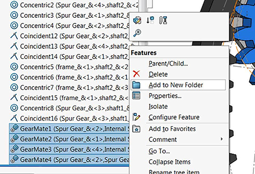To group the gear mates into a folder: shift-select the Gear mates, right-click, and select Add to New Folder. Drag it to the top of the Mates folder for ease of access.