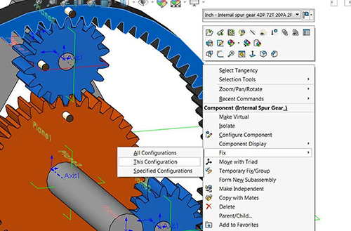 Now it’s time to create configurations for the three modes of movement. For each configuration a component will be fixed in place, before fixing any component be sure to unsuppress the alignment mates to ensure these components are in the correct position and then suppress the alignment mates once again. Add a configuration called “Ring Gear Fixed.” Right-click the Ring Gear and select Fixed, This Configuration only.