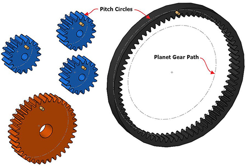 In each of the gear part files, pitch circles have been created as construction circle sketches. The Ring gear has an additional construction circle drawn to guide the path of the Planet gears. This will be key to correct motion and will be called the Planet Gear Path.
