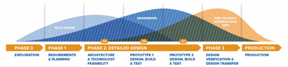 Embrace requirements, Gantt charts, and product process rigor at the right stage: There was a definite correlation between those companies who had formally written down their requirements and then followed a structured product development process and their success. The companies who struggled the most did the design in an ad-hoc manner. While this can be acceptable at first when you’re in experimentation mode (Phase 0 Exploration in the process chart below), it was inefficient and detrimental to success during the core development phases. Developing hardware is different than software. One of the comments I heard was that they should have gone slow to go fast. Slowing down, writing down requirements, planning, and following a proven development process for hardware saves time in the long run since you don’t end up redoing as much work. Below is an example of the product development process we use at Simplexity.