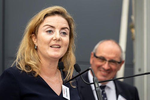 Bianca Braun, co-owner of the maxon Group at the opening of maxon France in September 2021 with Alain Pontille, CEO maxon France in the background